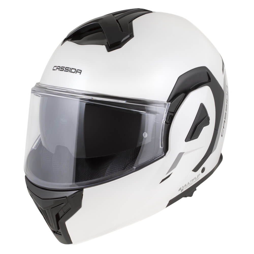 Der modulare Helm Cassida MultiFlip Solid mit patentierter Kinematik kombiniert eine Schale aus Polycarbonat und einen Innenkern aus EPS-Polystyrol für maximalen Schutz.