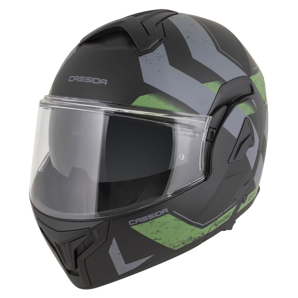 Der modulare Helm Cassida MultiFlip Korp mit patentierter Kinematik kombiniert eine Polycarbonatschale und einen EPS-Polystyrol-Innenkern für maximalen Schutz.